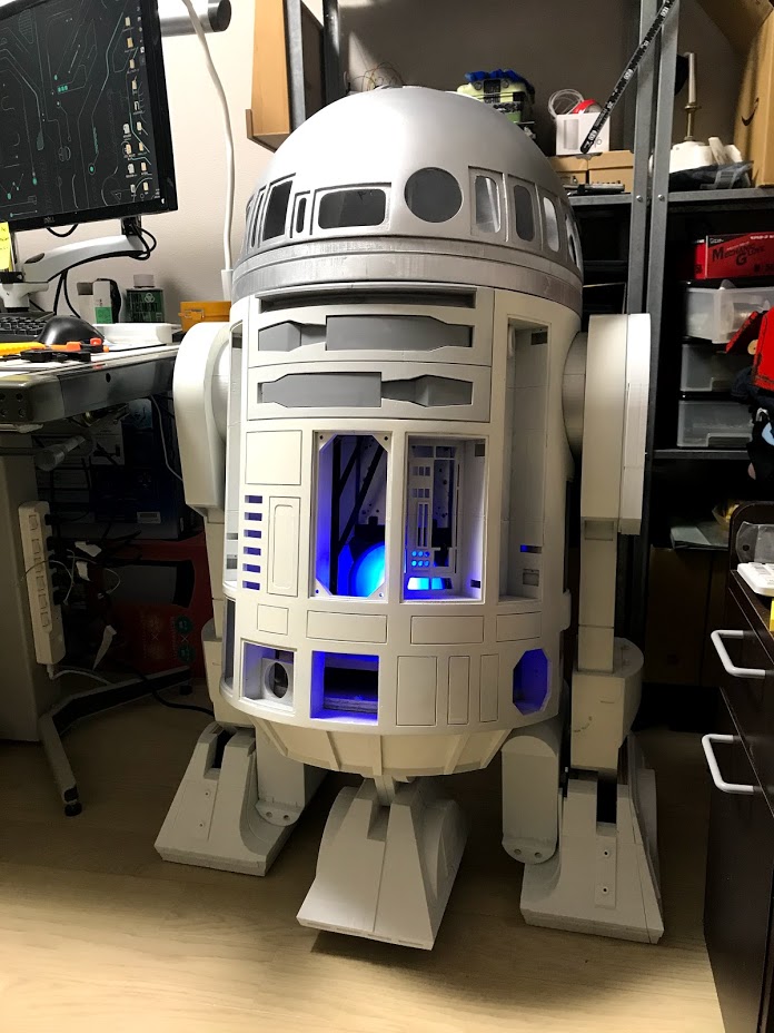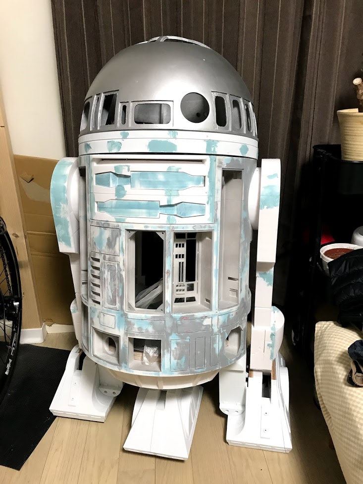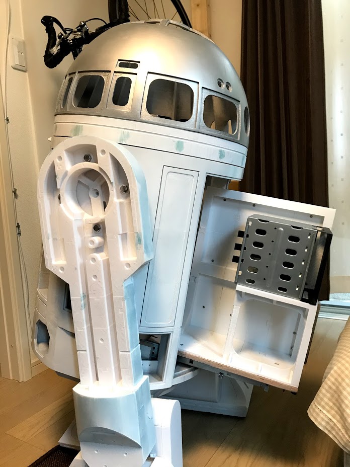 見た目でR2-D2と分かるようになってきたので、外で作業していると声かけられる率が高くなってきました。今度近所のスターウォーズファンのご夫婦が自宅にいるBB8と並べて写真を撮りたいとのことでしたので、R2の顔に泥を塗らないよう綺麗に仕上げて行きたいです。